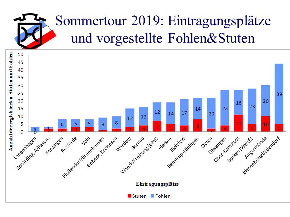 2019 konnten, ebenfalls wie 2018, auf 19 Plätzen Fohlen und Stuten vorgestellt werden. Die verschiedenen Registrier-Termine und die Anzahl der vorgestellten Fohlen und Stuten sind unserem Bericht über die Mitglieder-Versammlung am 01.02.20 zu entnehmen.