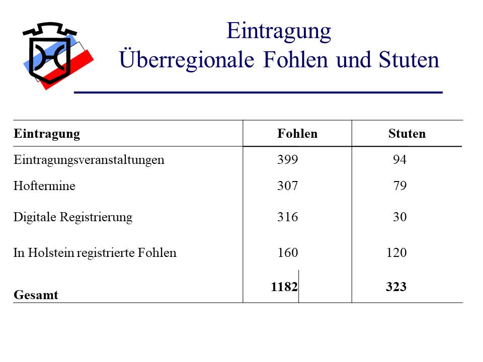 Insgesamt wurden 160 Fohlen und 120 Stuten von den 'Auswärtigen Mitgliedern' auf den verschiedenen Plätzen in Schleswig-Holstein vorgestellt bzw. registriert. Leider durften die Spitzenfohlen unserer Mitglieder nicht an den Championaten im Kernzuchtgebiet teilnehmen.